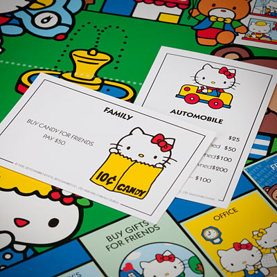 hello kitty monopoly. i dont need it but i feel like i have to since i am a big hello kitty fan since way back when before hello kitty became this too famous for me that i pretty much dont want to buy any of the new style. (pretty much since hello kitty made her way into Hot Topic days). but looking at the style of this, it reminds me of the old 1976 design.